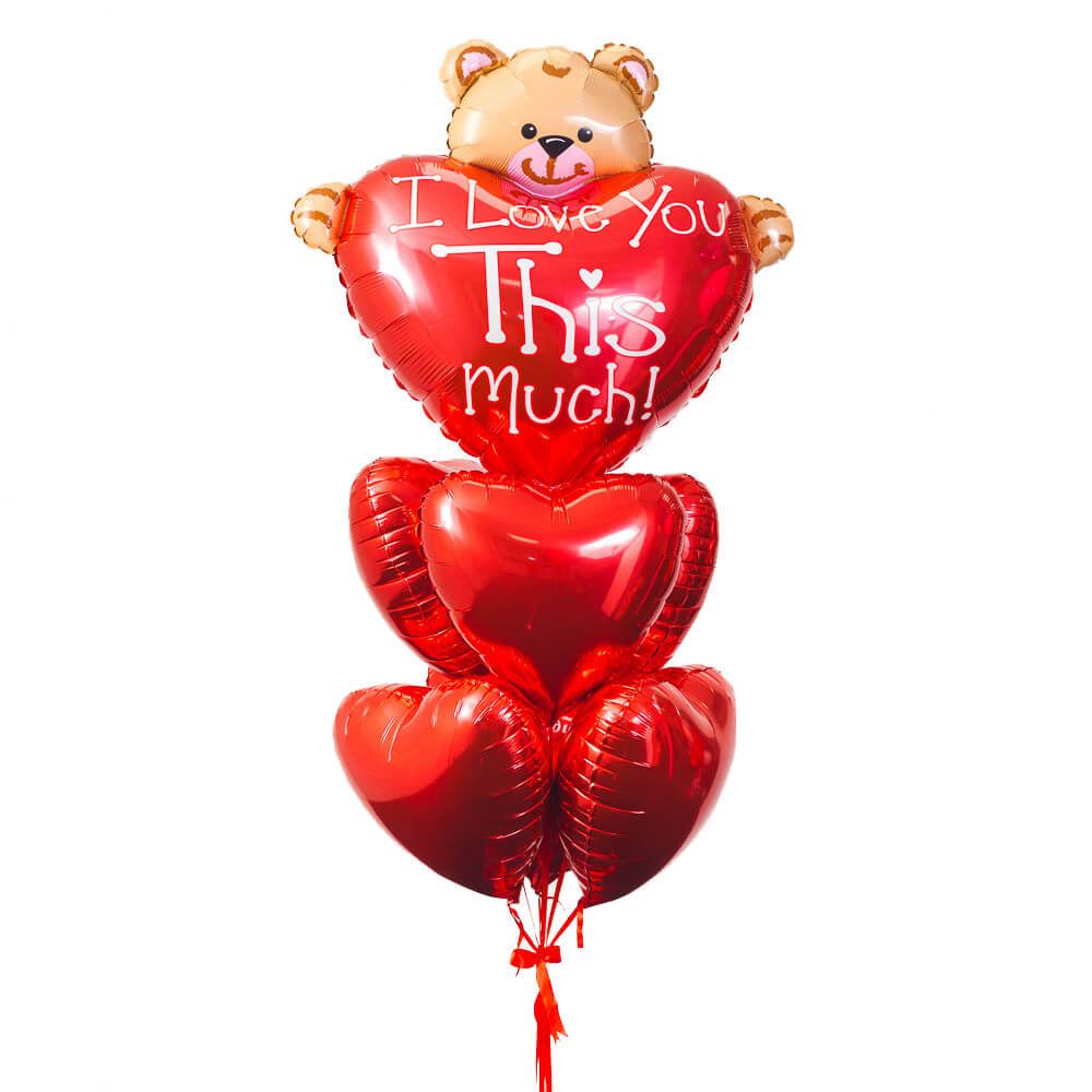 Фонтан с грузиком — 2 шт Фигура «Медвежонок с большим сердцем», 97 см — 1 шт Красное фольгированное сердце 46 см — 6 шт