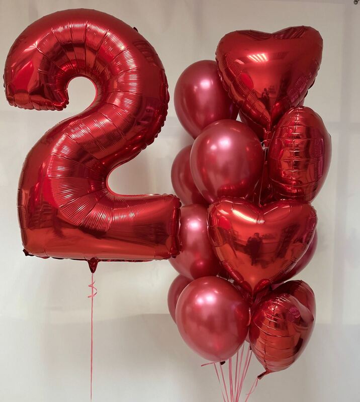 Красное фольгированное сердце 46 см — 6 шт Шар цифра 2 красная, 102 см — 1 шт Латексный шар 30 см, хром, красный — 10 шт
