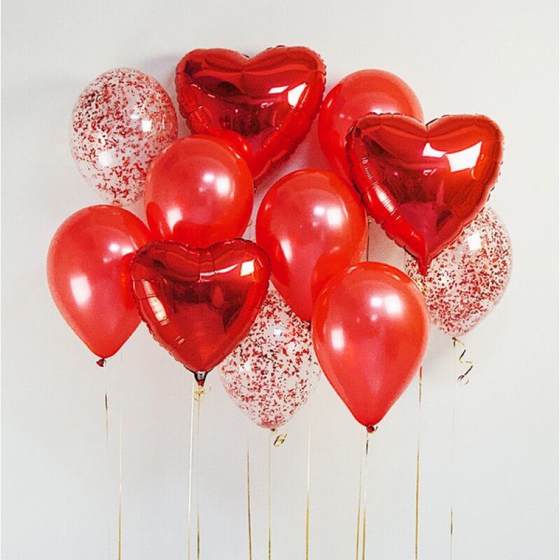 Красное фольгированное сердце 46 см — 3 шт Латексный шар 30 см, металлик, красный — 5 шт Шар 30 см, прозрачный, кристалл — 3 шт