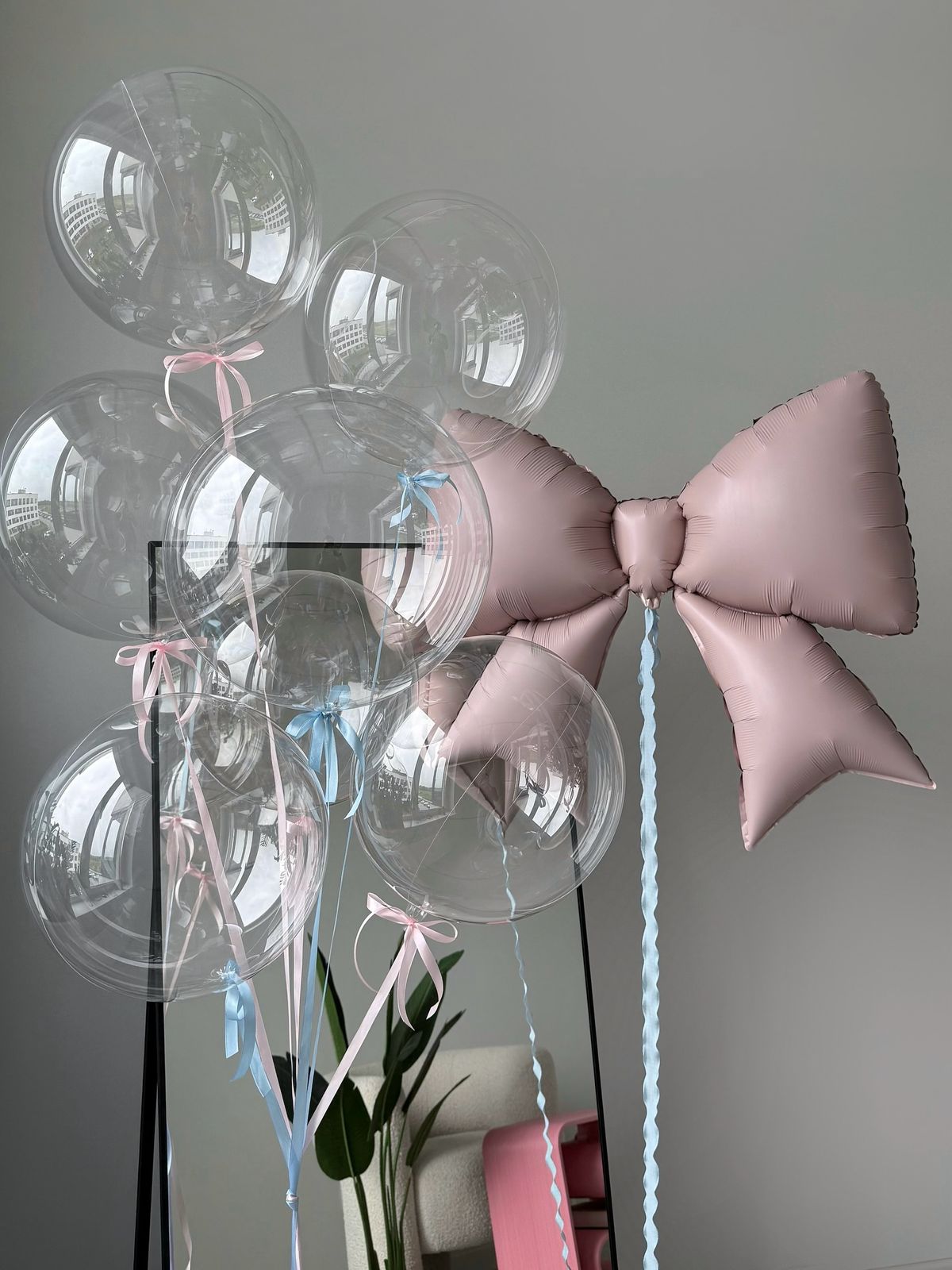 Фигура «Бант», розовый, сатин 99 см — 1 шт Шар 3D Deco Bubble 46 см, кристалл, прозрачный — 7 шт