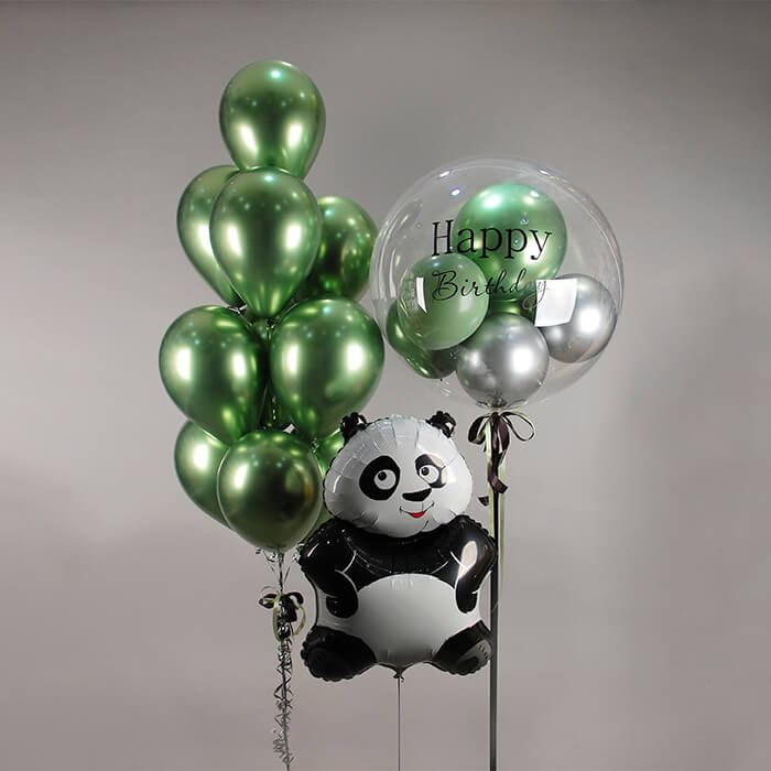 Фонтан с грузиком — 1 шт Латексный шар 30 см, хром, лайм — 10 шт Фигура Панда, 84 см — 1 шт Шар 3D Deco Bubble 46 см, кристалл, прозрачный — 1 шт