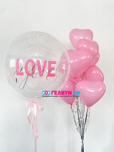 Латексное сердце 30 см, розовое, пастель — 10 шт Шар 3D Deco Bubble 46 см, кристалл, прозрачный — 1 шт Наклейка на шар Bubble — 1 шт