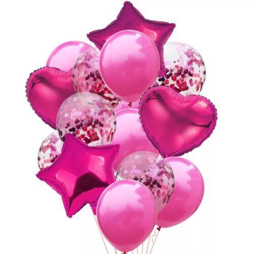 Шар 30 см, прозрачный, кристалл — 5 шт Фуше фольгированная звезда 46 см — 2 шт Шар фольгированное сердце, фуксия, 46 см — 2 шт Латексный шар 30 см, металлик, фуше — 5 шт