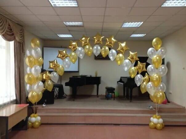 Золотая фольгированная звезда 46 см — 11 шт Латексный шар 30 см, металлик, белый — 21 шт Латексный шар 30 см, металлик, золотой — 21 шт