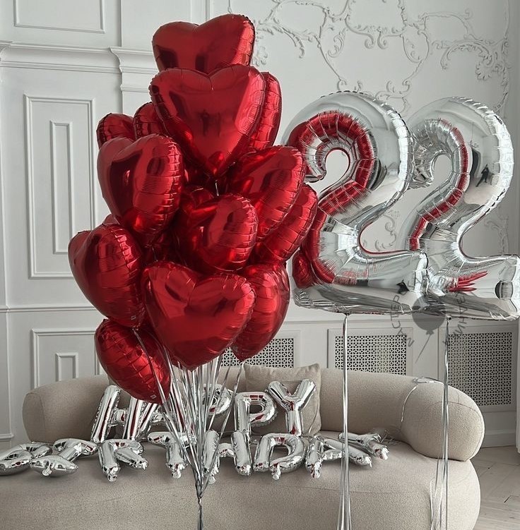 Красное фольгированное сердце 46 см — 15 шт Цифра 2 серебряная, 102 см — 2 шт Набор букв «Happy Birthday», серебро, 41 см — 1 шт