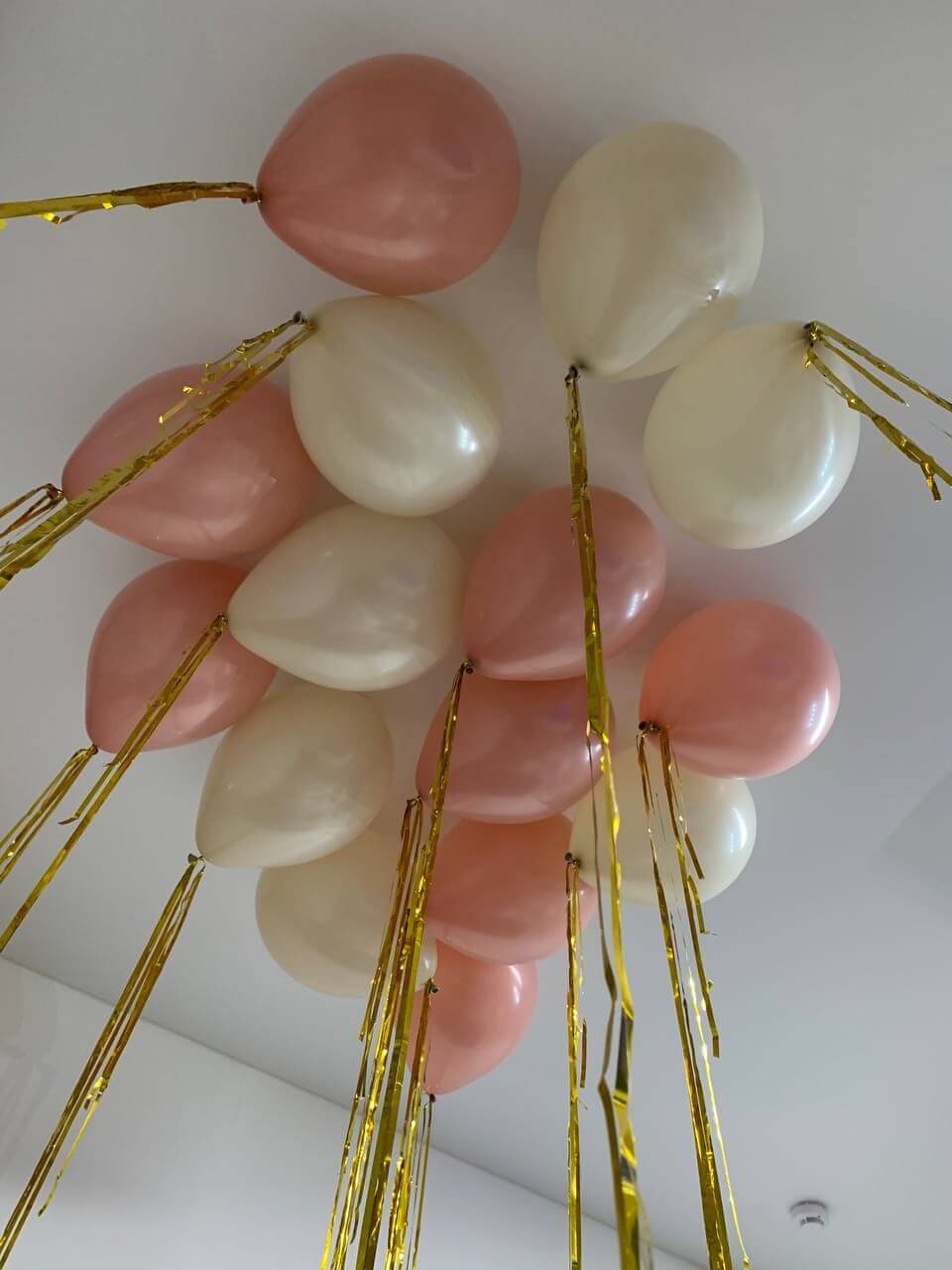 Шар 30 см, Белый песок, пастель — 7 шт Дождик золотой на шар 30 см — 15 шт Латексный шар 30 см, пастель, розовое дерево — 8 шт