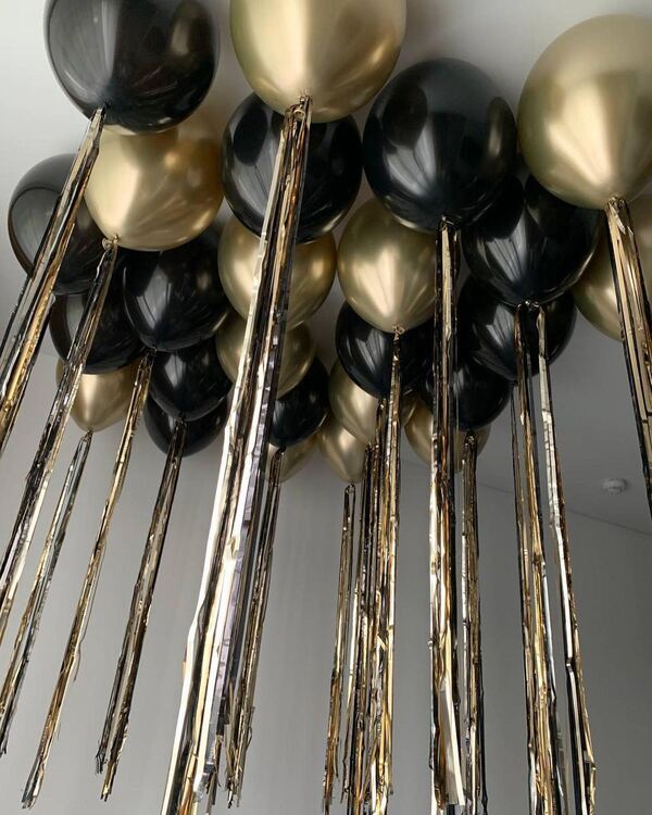 Дождик золотой на шар 30 см — 25 шт Латексный шар 30 см, пастель, чёрный — 13 шт Латексный шар 30 см, хром, золотой — 12 шт