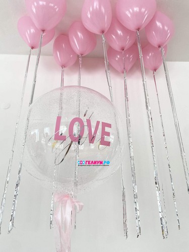 Латексное сердце 30 см, розовое, пастель — 10 шт Шар 3D Deco Bubble 46 см, кристалл, прозрачный — 1 шт Наклейка на шар Bubble — 1 шт