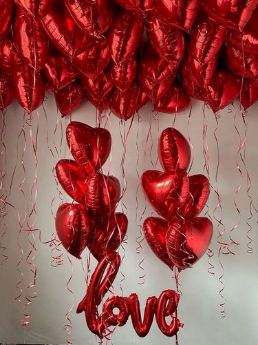 Фонтан с грузиком — 2 шт Красное фольгированное сердце 46 см — 50 шт Фигура надпись «Love», 104 см, красный — 1 шт