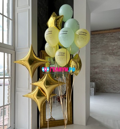 Шар, Школьная тетрадь, Ассорти Макаронс 30 см — 8 шт Золотая фольгированная звезда 46 см — 2 шт Фигура 4х-конечная золотая звезда — 3 шт